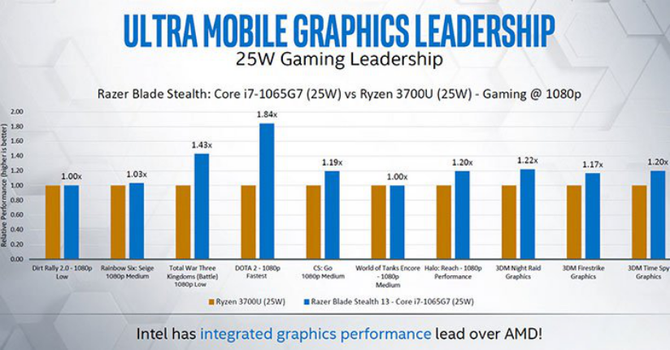 當(dāng)然,最有意思的,應(yīng)該還是和AMD的處理器做比。眾所周知,AMD移動版處理器內(nèi)置的Vega核顯是擁有入門獨顯級別性能的,比此前英特爾的Gen 9核顯要強出不少,但是隨著Gen 11核顯的到來,情況似乎發(fā)生了逆轉(zhuǎn),根據(jù)官方給出的數(shù)據(jù)顯示,在1080P分辨率下,i7-1065G7(25W)在很多測試的游戲中都超越了采用Vega 10核顯的Ryzen 7 3700U(TDP同樣是25W),在《Dota 2》游戲中甚至有1.84倍的性能領(lǐng)先,最不濟也能保證持平。